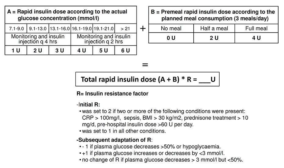 Nonetheless, these studies are limited, either focusing only on body mass index (BMI) to estimate insulin requirements, aiming at relatively high target glucose levels (5.6–10 mmol/l), or using a retrospective study design [8–11, 13]. BMI is not the only factor associated with insulin resistance. Additional factors such as acute illness-associated inflammation and stress hormone release may be involved [14–19]. Therefore, insulin requirements are expected to be variable in hospitalised patients and depend on the underlying medical condition, with important intraindividual differences [20]. The extent of insulin resistance is usually not known on admission, and insulin requirements may change rapidly during the course of hospitalisation.