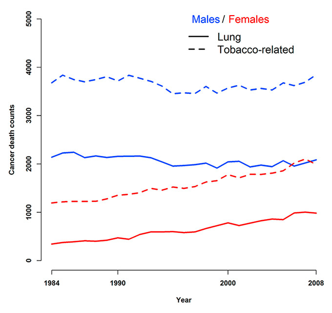 Preliminary analysis suggested similar trends in lung and tobacco-related cancer mortality in Switzerland during 1984 to 2008 (fig. 2). Death counts for males were stable, while for females they increased steadily.