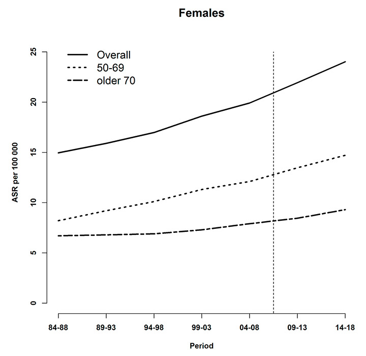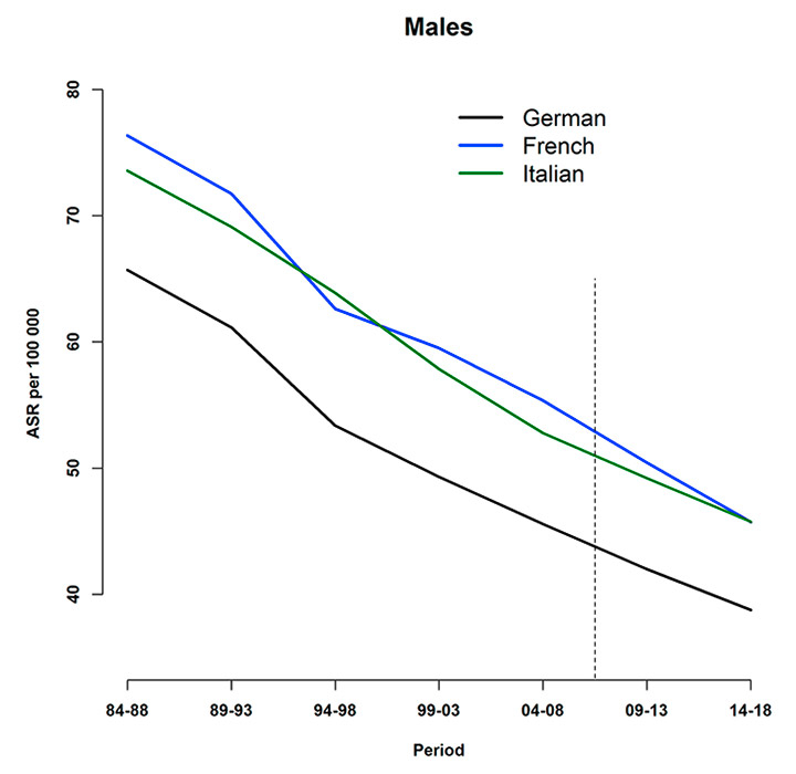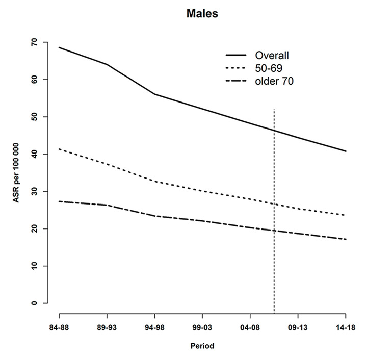 For males, a decreasing trend was seen which was less pronounced from 1994–1998 onwards. On the other hand, projected absolute death counts increased during 2009–2013 and 2014–2018 (table 1), reflecting the demographic aging of the population (fig. 4).