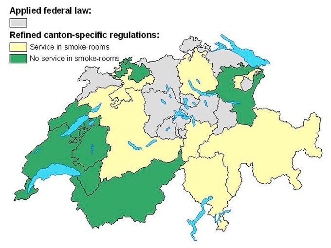 Canton-specific smoking ban regulations indicating application of the federal law (”Bundesgesetz zum Schutz vor Passivrauchen”) (in grey), further regulations covering service in smoke-rooms (in yellow) and no service in smoke-rooms (in green).
