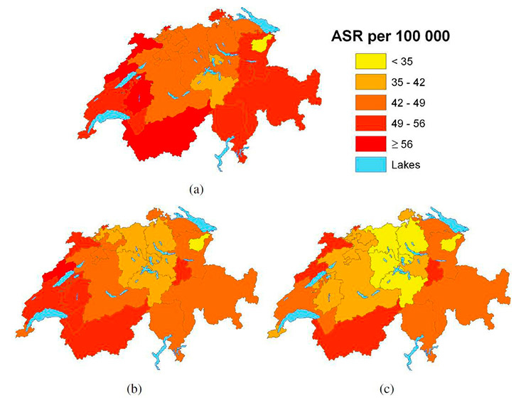 Random effects at cantonal level were considered to account for the spatial correlation in mortality which arises from similar exposures (e.g. environmental factors, cultural characteristics, health policies) in neighbouring areas. The models were formulated within the Bayesian framework of inference, with CAR priors adopted for the random effects. The Bayesian approach enables computation via the use of MCMC and smooths the rates so that estimates from areas with small populations do not dominate [16].
