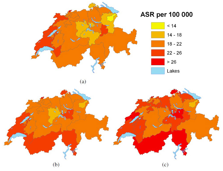 Cantons with a small number of cases, which did not allow for reliable estimates, were merged with their neighbours. These included canton Uri, Obwalden and Nidwalden, as well as Appenzell Ausserrhoden and Appenzell Innerrhoden. A map of Switzerland, as well as the cantonal abbreviations, are provided in Appendix A http://www.smw.ch/fileadmin/smw/pdf/SMW-13771-Appendix_A.pdf . ArcGIS, a geographic information system, was used to create maps illustrating the results. The required shapefile describing the spatial configuration of the cantons was obtained from the FSO and modified.