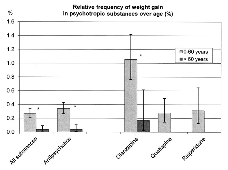 Differences in weight gain could be found between elderly and younger patients during treatment with psychotropic substances in general, with antipsychotics as a class, and with olanzapine (fig. 4). Weight gain was not found in the elderly at all for quetiapine and risperidone, although 2060 and 953 elderly patients received quetiapine and risperidone, respectively.