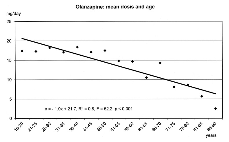Regression analysis showed that weight gain during olanzapine treatment decreased significantly with age. This relationship could not be explained by the differences in dosages which showed no significant relation to age in the group of patients with weight gain under olanzapine.