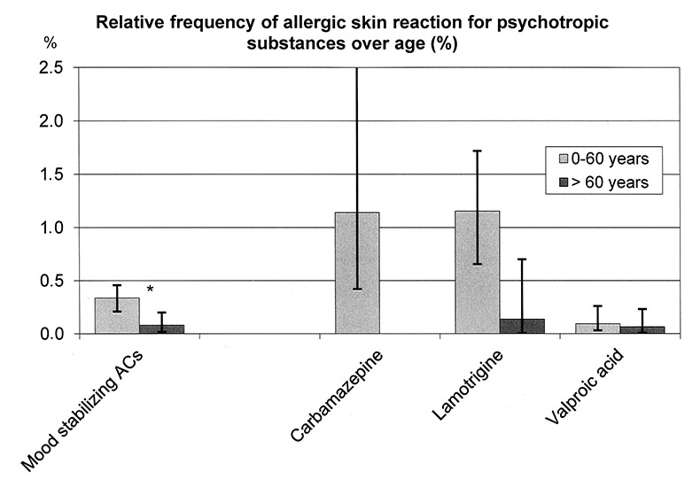 Furthermore, elderly patients could already have had experience with psychopharmacological treatment and its ADRs. Their physicians might have avoided medication that was not tolerated. In contrast, younger patients might have received certain substances for the first time and thus have reacted with various ADRs. This might be a factor contributing to the lower rate of allergic skin reaction observed in the older age group with mood-stabilising anticonvulsants.