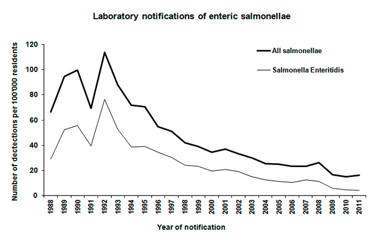 Salmonellosis belongs to the infectious disease group which has to be reported mandatorily in Switzerland. Since 1992, the number of reported cases is declining, a phenomenon which is also observed within the European Union. An improvement of the epidemiological situation is also reflected by the decreasing annual number of outbreaks [3].