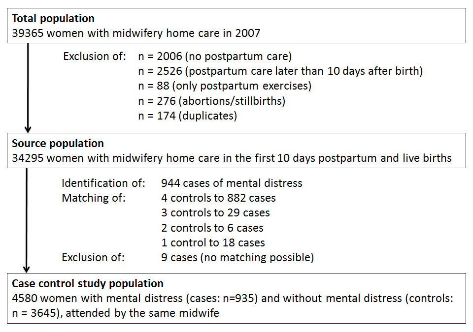 We used the 2007 data, covering all mothers whose midwifery home care was completed between 1 January and 31 December 2007. Overall, 722 independent midwives provided care for 39,365 women [19]. For the present study, we included only mothers with live births and with midwifery care in the first 10 days after childbirth (N = 34,295) (fig. 1). From this source population, both cases and controls were sampled for the present nested case-control study to analyse a range of exposures potentially associated with maternal distress.