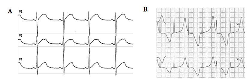 (A) Example of notched T waves from a 37-year old man affected by long QT syndrome (LQTS) who suffered two syncopal episodes. (B) Example of T wave alternans from a 2-year old LQTS patient with multiple episodes of cardiac arrest. Both tracings are from a 24-hour Holter recording. (Reproduced from reference [39].)