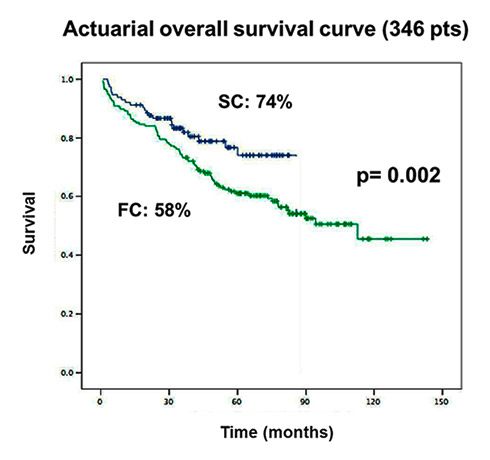 Actuarial overall survival (346 patients); SC: blue; FC: green.