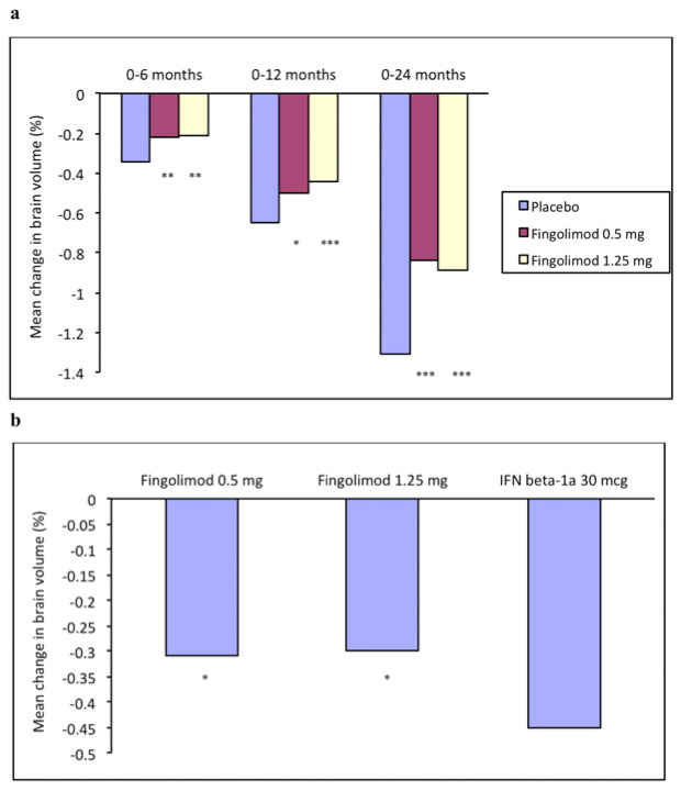 (a) Mean change in brain volume in patients with relapsing-remitting multiple sclerosis receiving oral treatment with fingolimod, 0.5 or 1.25 mg, or placebo once daily for 2 years in the FREEDOMS Study [11]. *,**,***p ≤0.05, 0.01, 0.001, respectively, versus placebo
