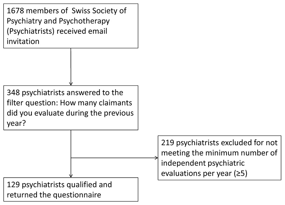 Our study population were psychiatrists who had conducted a minimum of five IMEs of work capacity during the previous year. We distributed the survey through the mailing list of the Swiss Society of Psychiatry and Psychotherapy (SGPP) to its 1,678 members. An invitation letter from the presidents of the SGPP and the Swiss Society of Insurance Psychiatry informed participants about the purpose of the survey, time to completion (15 minutes), confidentiality of the data and our intention to publish the results. We sent a reminder after three weeks.