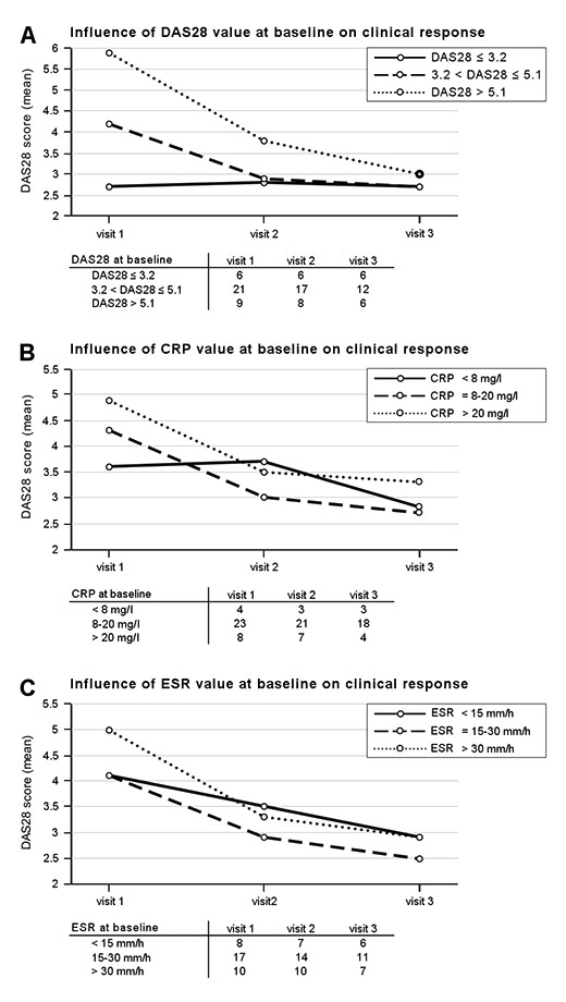 Likewise, patients seemed to respond to abatacept treatment irrespective of baseline ESR or CRP, achieving a comparable mean DAS28 at visit 3 within an individual category (fig. 6B and 6C).