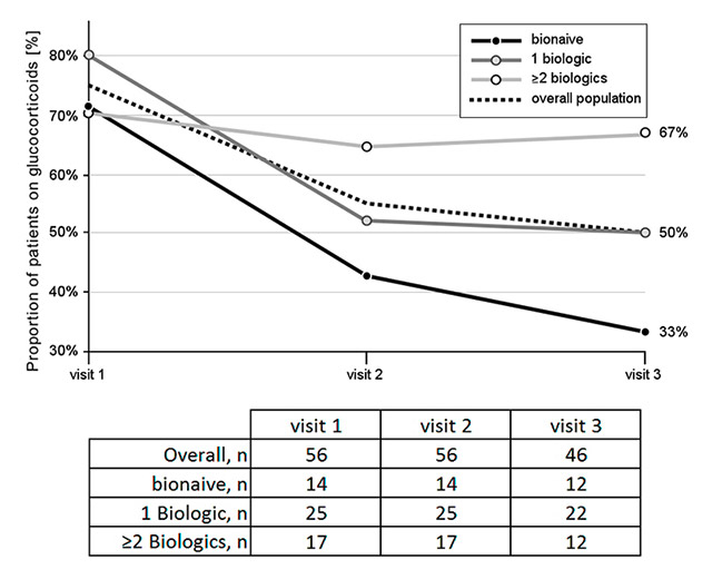 In parallel, there was a decrease in the concomitant use of glucocorticoids (fig. 4). This effect was more marked in the biologic-naïve patients as compared to the patients previously treated with 1 biologic. In contrast, no reduction on concomitant glucocorticoid use was observed in patients pre-treated with ≥2 biologics.