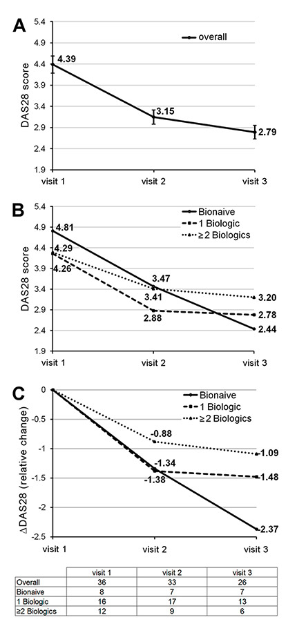 The mean DAS28 declined in the overall population from 4.39 (visit 1) to 2.79 (visit 3). Although baseline DAS28 was higher in the biologic-naïve subpopulation than in the groups with prior biologic treatments, biologic-naïve patients tended to demonstrate a better DAS28 response (fig. 3). The relative DAS28 reductions were –1.09 for the group pre-treated with ≥2 biologics, –1.48 for the group pretreated with 1 biologic, and –2.37 in biologic-naïve patients (fig. 3).