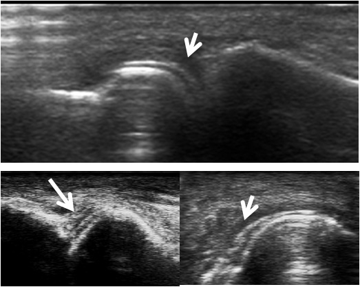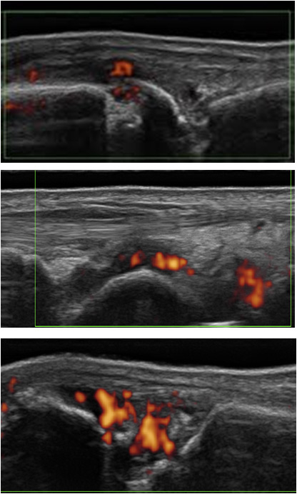 Synovitis can be demonstrated by US, appearing as hypoechogenic hypertrophy of synovial tissue in greyscale (B-mode). With the new US machines, synovial hypertrophy can be distinguished from fluid collection in most cases. For the detection of synovial hypertrophy, US is much more sensitive than clinical examination and can compare to MRI, especially when finger joints are evaluated [8]. The presence of vascularisation inside the synovial tissue in Doppler (PD) mode reflects active inflammation [9]. However the performance of PD is highly dependent on the quality of the machine, as well as subtle modification of the settings, the experience of the operator and the localisation of the examined joint (best in superficial joints) [10–11]. US can also differentiate between synovial inflammation and tenosynovitis, bursitis and other soft tissue lesions that can mimic clinical synovitis [7–8].