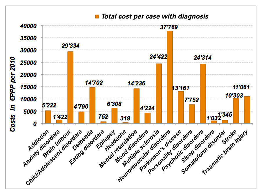 The new data on the size and burden of brain diseases or disorders from the EBC 2010 studies have provided an update of the 2005 assessment of disorders of the brain in the European Union, Iceland, Norway and Switzerland. The inclusion of a broader set of diagnoses than in the first study in 2005 has led to a two times higher estimate of the costs of brain disorders in 2010. With respect to Switzerland, the total cost of nearly 9 Billion EUR in 2005 rose to 14.5 Billion EUR in 2010, which is a slightly smaller increase compared to that of other countries. The specific findings and limitations as well as the implications will be discussed in the following sections.