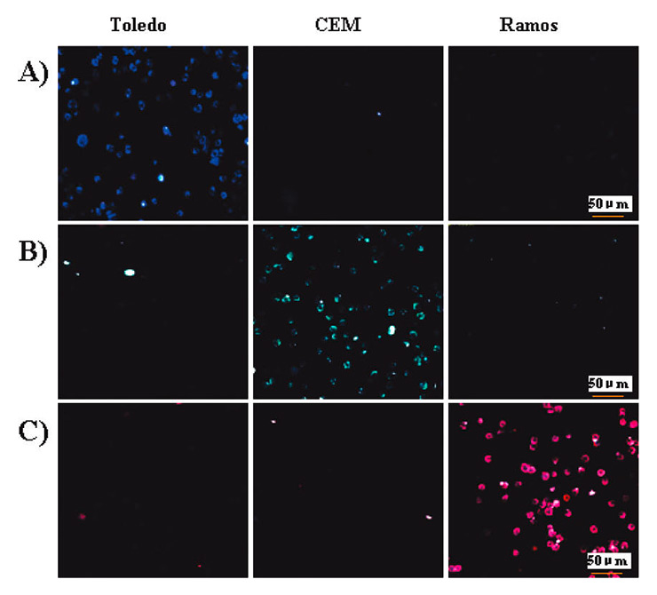 Confocal microscopy images of individual nanoparticle-aptamer conjugates with the three different cells (Toledo, CCRF-CEM, and Ramos): (A) nanoparticle-(FAM)-aptamer T1, specific for Toledo, (B) nanoparticle-(FAM-R6G)-aptamer sgc8, specific for CCRF-CEM, and (C) nanoparticle-(FAM-R6GROX)-aptamer TDO5, specific for Toledo. Reprinted with permission from [35]. Copyright 2009 American Chemical Society.