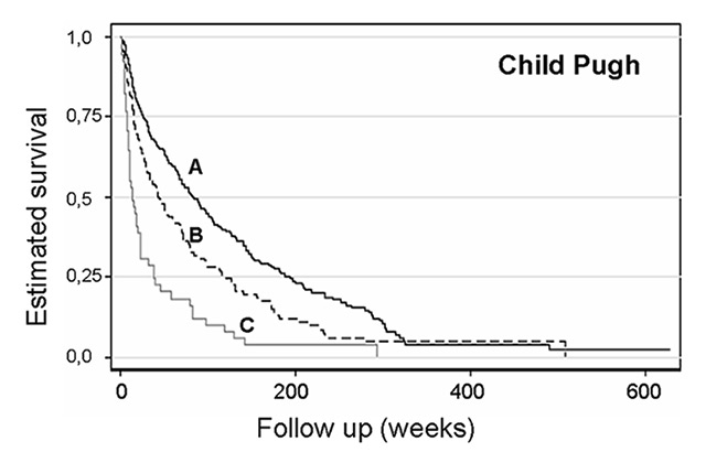 Kaplan-Meier curve for survival by Child Pugh score in patients with hepatocellular cancer (n = 301, 132 and 51 for Child Pugh A, B and C, respectively; p <0.001 for difference between the subgroups).