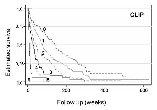 Kaplan-Meier curve for survival by CLIP score in patients with hepatocellular cancer (n = 131, 155, 98, 51, 29, 17 and 3 for CLIP 0‒6, respectively).