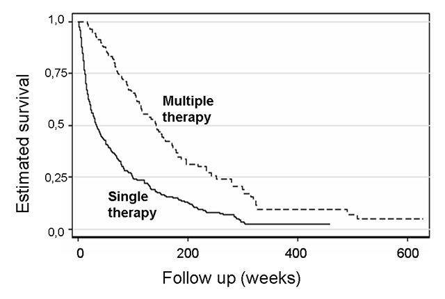Overall, 71.6% of the patients were treated with more than one therapeutic option (table 5, fig. 5). The combination therapy prolonged median survival significantly when compared with a monotherapeutic strategy (141 vs 33 weeks, p <0.001). Only 55% of the patients were treated as recommended in the BCLC system.