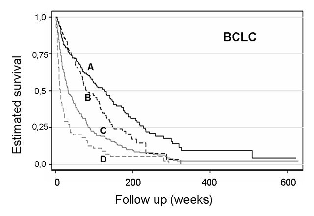 BCLC = Barcelona clinic liver cancer score p <0.001 for B vs A, C vs B and D vs C; percentage of BCLC 0 patients underpowered for statistical analysis |