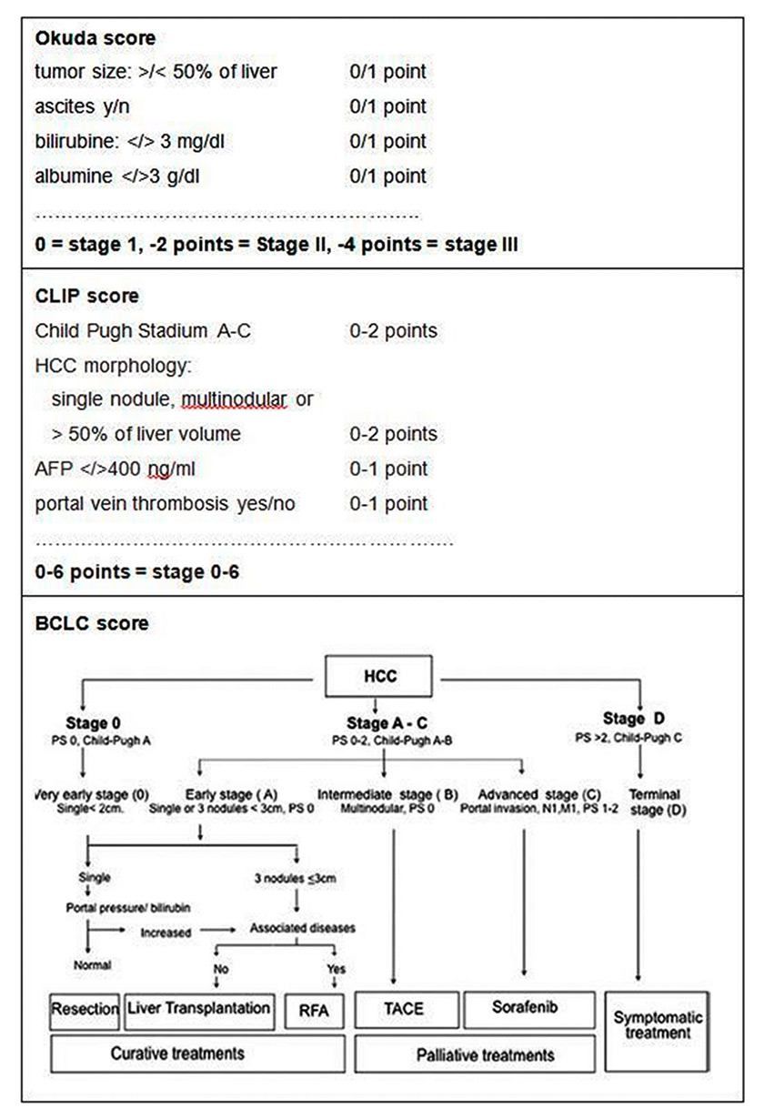 Principles of the Okuda, CLIP and BCLC scores as described in the literature [6, 12, 14].