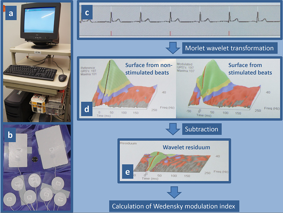The device for Wedensky modulation consists of a standard computer system equipped with an adapter for the special electrodes and software for analysis of the ECG signal (a). The set of electrodes includes two large-size electrodes for the application of sub-threshold stimuli, which are placed on the sternum and back, and seven small-size electrodes for the recording of a high resolution ECG (b). Example of an ECG recording (c): the white tick marks show where the software detected an R-wave, and the red tick marks show when a sub-threshold stimulus was delivered. ECG recordings are analysed using three-dimensional Morlet wavelet transformation separately for stimulated and non-stimulated heart beats. The wavelet transformation averages the vector magnitude of the beats, separates the frequency of the beats, and displays the results as a three-dimensional surface whose axes are time (x axis), frequency (y axis), and amplitude (z axis) (d). To reveal the difference between the stimulated and non-stimulated beats the surfaces are arithmetically subtracted resulting in a wavelet residuum (e). Any variation in the wavelet residuum plane represents a response caused by the stimulation. The key indicators of the wavelet residuum are mathematically combined to calculate the Wedensky modulation index.