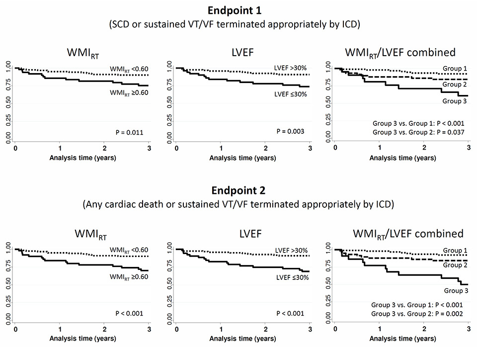 Figure 3 shows the Kaplan-Meier survival estimates for WMIRT, LVEF and the combination of both predictors for the prediction of both endpoints. Of note, the combination of a WMIRT ≥0.60 and LVEF ≤30% resulted in a PPV of 36% for endpoint 1 and of 50% for endpoint 2. Compared with LVEF alone, the increase in PPV with use of both predictors combined was not significant (p = 0.280 for endpoint 1 and p = 0.095 for endpoint 2).