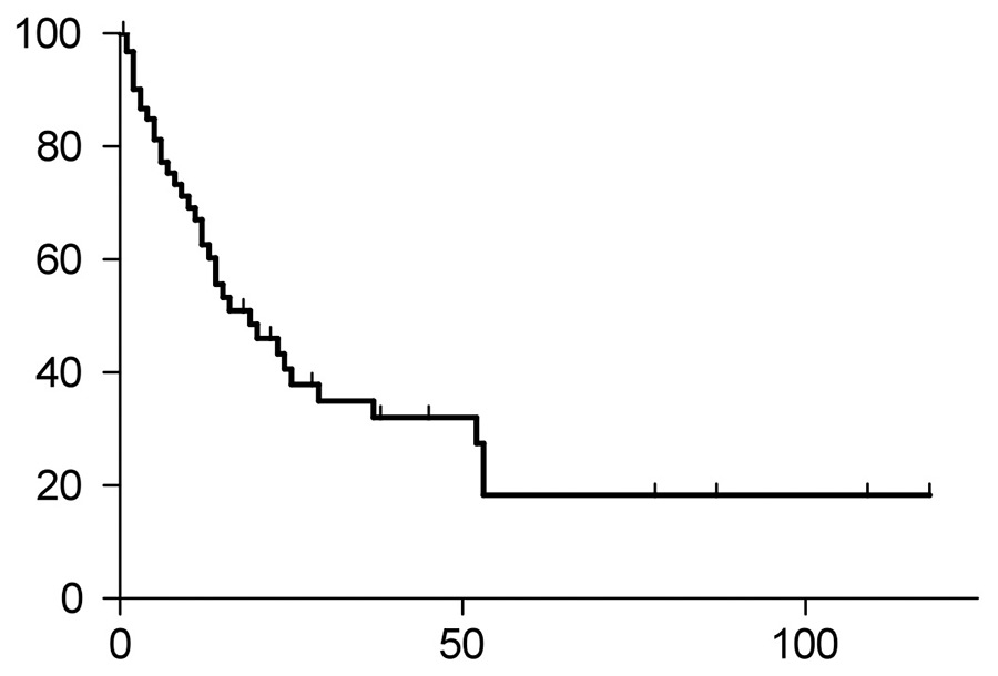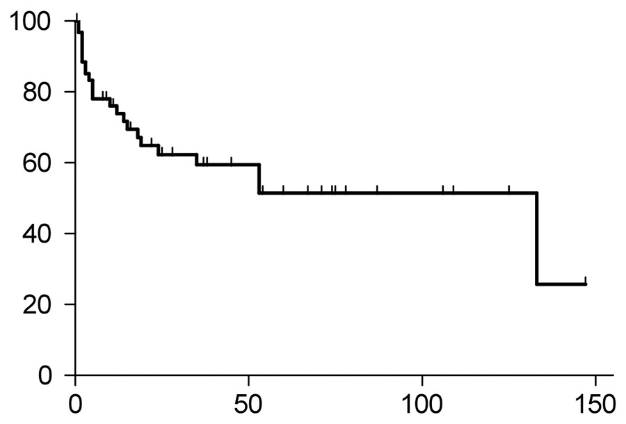 Time to progression (TTP) of the entire study group. Median TTP was 39 months, and 36 patients had progression of their disease.