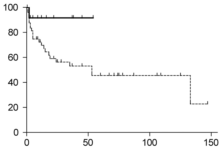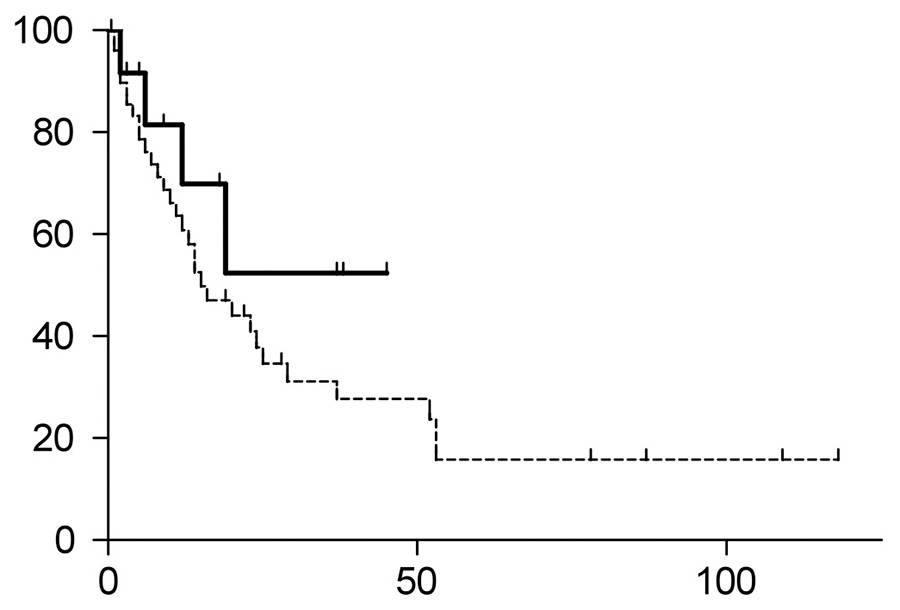 Overall survival of patients treated with HDCT/ASCT (continuous line) versus conventional chemotherapy (dotted line). The HDCT/ASCT showed a trend toward better overall survival (p = 0.0651). The HDCT/ASCT group had not yet reached median overall survival, whereas the median overall survival of the conventional chemotherapy group was 53 months.