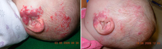 Infantile haemangioma of the face at 2 months (left) and after 2 weeks (right) of treatment with propranolol (2 mg/kg/day).