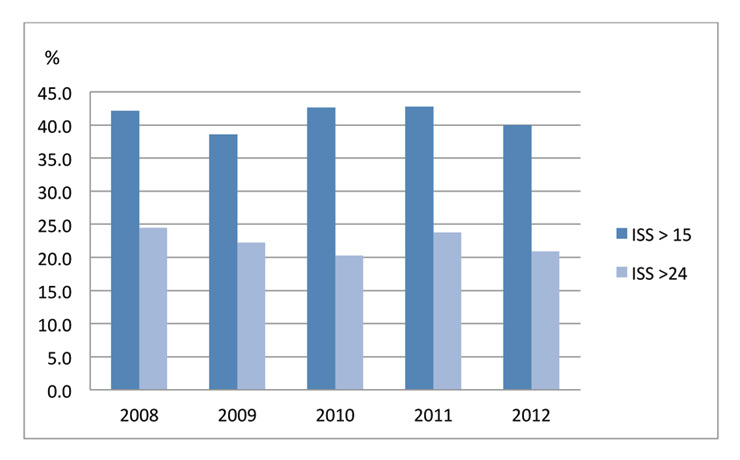 Annual incidence of severely (ISS >15) and seriously injured (ISS >24).