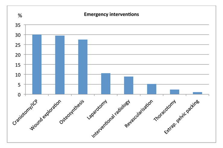 Overall, 466 patients (29.1%) underwent an emergency intervention (defined as an immediate transfer from shock room to the operating room or the angiographic facility; fig. 4). Main specialties involved were orthopaedic surgery (27.3%) and neurosurgery (26.3 %), followed by plastic surgery for burn care (15.4%) and visceral surgery (13.9%). Emergency angiography and embolisation was performed in 8.8% of patients as part of the initial haemostatic procedure. Overall, 700 (43.8%) had a surgical/radiological intervention within the first 24 hours after admission and 59.1% of patients had at least one surgical intervention during their hospital stay.