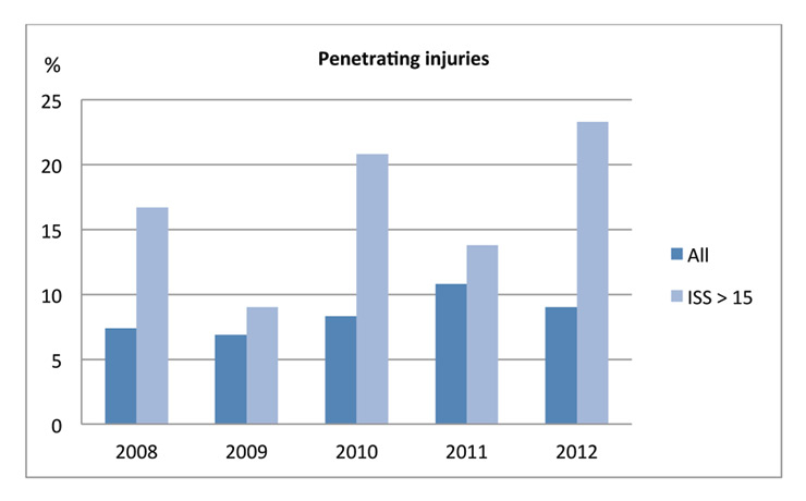 Annual incidence of penetrating injuries, overall and amongst severely injured patients.