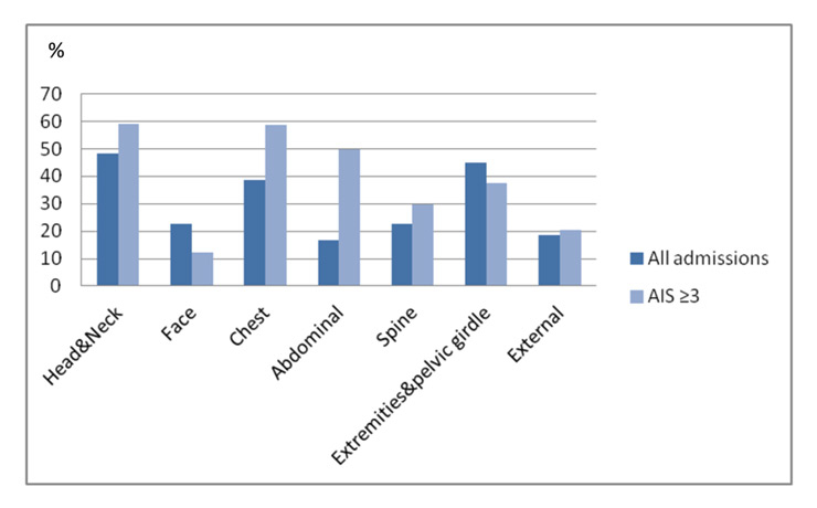 Incidence of injury in each body region, overall and severe (AIS score ≥3).