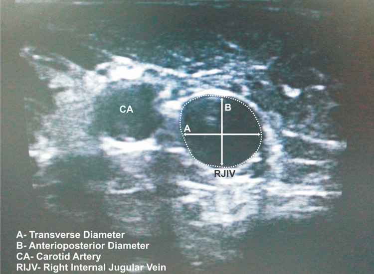 Three sets of images taken from every patient were evaluated by an anaesthetist who was not aware which group of ventilation mode the image belonged to. The CSA, transverse and anteroposterior diameters were measured using the built-in software of the ultrasound. Anteroposterior diameter is the distance between the anterior and the posterior wall of the RIJV. Transverse diameter is the distance between the medial and lateral wall of the RIJV (fig. 1).