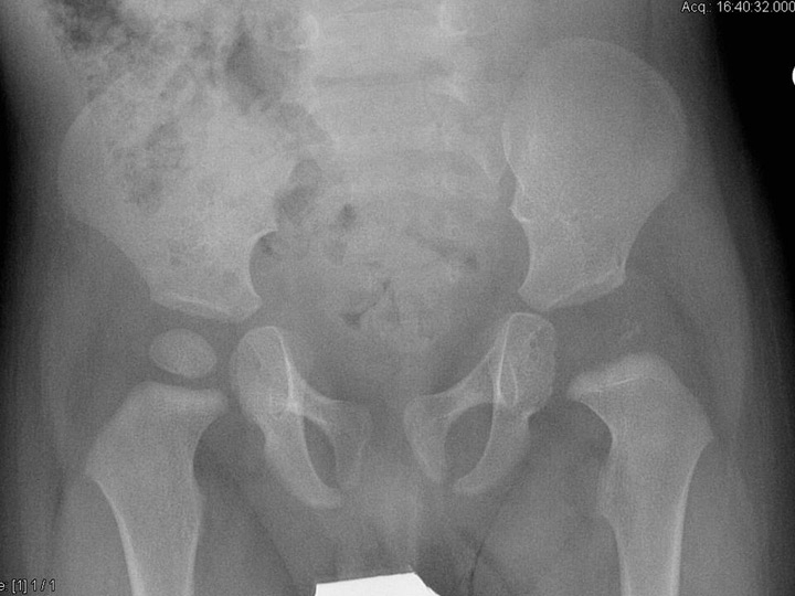 An 8-month-old boy sustained osteoarthritis of the left hip due to Streptococcus pneumoniae. Six months after the infection, the epiphyis had completely disappeared, confirming that children with osteoarticular infection due to S. pyogenesare more likely to have joint involvement, spread of infection into the epiphysis, and thus subsequent disturbed epiphysial growth.