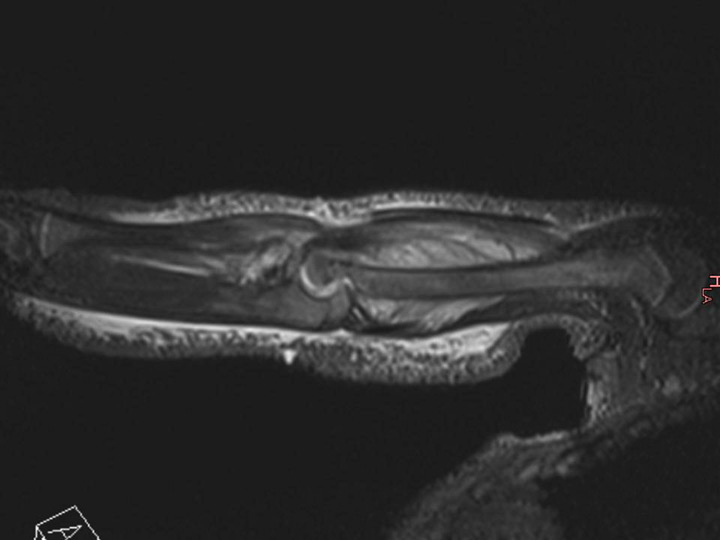 Magnetic resonance imaging (MRI) of the distal femur of a 17-month-old boy, which showed a normal appearance on plain radiographs. MRI demonstrated a lytic lesion of the distal femoral epiphysis with an important abscess of the soft surrounding tissues. Specific cultures confirmed tuberculosis.