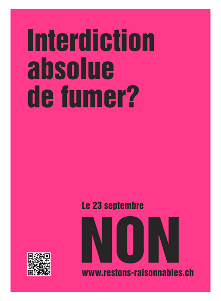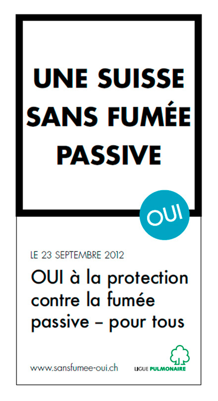 Not only were the gains brought by the initiative relatively small, these gains were also not well communicated to the public (perhaps because they were not easy to communicate simply). While its aim was to fill gaps left by the federal law, this was not clearly explained or was explained in terms that were too general, such as “A Switzerland without passive smoking.” Furthermore, in newspaper adverts and on outdoor billboards, the slogans used by the proponents of the initiative were put inside a thick black rectangular frame, mimicking the frames used for textual health warnings on cigarettes packs (fig. 4). People expect to see negative messages inside such frames – such as “Smoking kills” – and, as such messages get very repetitive, they no longer read them, as the result of a “wear-out” phenomenon well known in advertising, which has been found to also apply to textual health warnings on cigarette packages [24, 25]. This rather unfortunate graphic design decision further weakened the positive impact of the message.