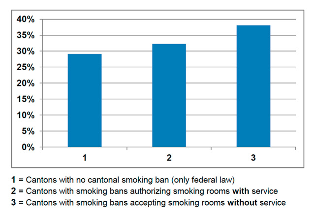 Exposure to second-hand smoke is responsible for respiratory symptoms, lung cancer, myocardial infarction and stroke, among other diseases [2]. As the health risks associated with second-hand smoke became more apparent, smoke-free regulations in workplaces as well as indoor public places, including hospitality venues, were progressively introduced in a number of jurisdictions at a local or national level. On 1 May 2010 the Swiss Parliament passed a nationwide smoking ban although not a comprehensive one. This partial smoking ban follows the so-called Spanish model[3]. While it covers most work spaces and public indoor areas, it includes notable exceptions: smoking establishments are authorised if they are smaller than 80 square meters; dedicated smoking rooms with full service are allowed in larger establishments, employees having to work in a smoking environment are merely required to have a statement in their employment contract saying that they agree to be exposed to tobacco smoke. The Swiss legislators have resolved the issue of occupational safety and health with respect to exposure to tobacco smoke, a well-known carcinogenic agent, in a rather peculiar way: by discharging the employers from this responsibility and transferring it to the employees. The workforce is split into two categories, one which enjoys full protection from second-hand smoke (i.e., those working in smoke-free establishments) while the other must suffer its consequences and is required to assume responsibility for the lack of protection.