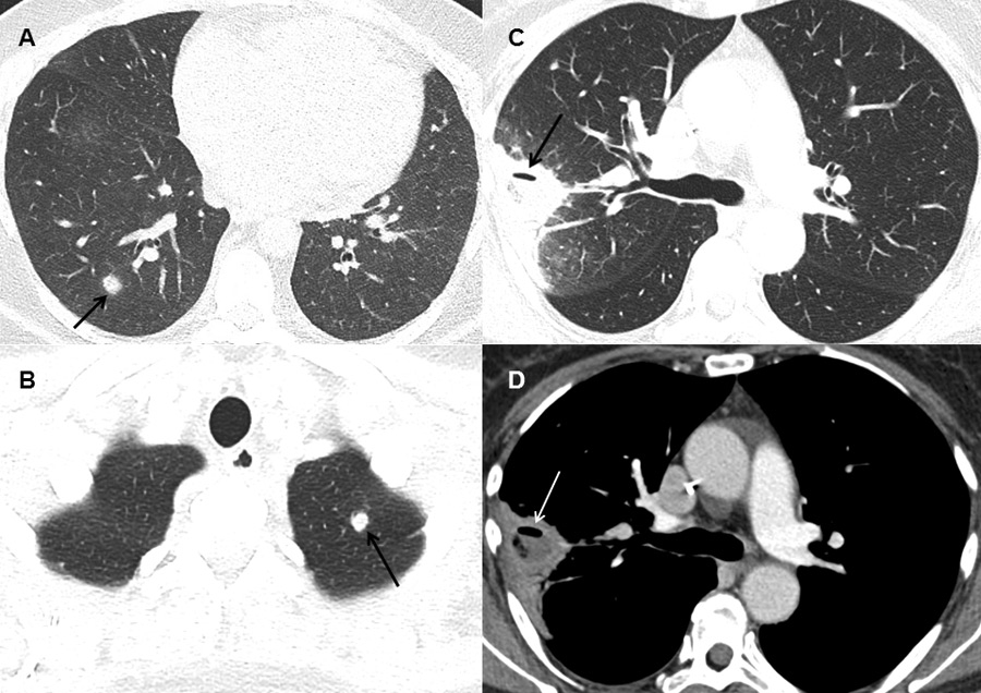 (A) Dense, well-circumscribed lesion with a halo (arrow) in the right lower lobe in a patient with possible invasive fungal infection (IFI) (B) Dense, well-circumscribed lesion in the left upper lobe (arrow) in a patient with possible IFI (C and D) Dense lesion with an air-crescent sign (arrows) in the right upper lobe in a patient with proven IFI (mucorales spp.).
