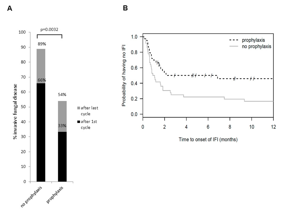 (A) Patients with invasive fungal infection (IFI) after first cycle (non-prophylaxis 65.8% vs. prophylaxis 33.3%; p = 0.0088) and after the last cycle of chemotherapy (non-prophylaxis 88.9% vs. prophylaxis 53.9%; p = 0.0032), respectively. (B) Kaplan-Meier plot for fungal-free survival: Log rank test p = 0.0194. The projected IFI-free survival at 100 days was increased (50.1% vs. 25%; p = 0.0526).