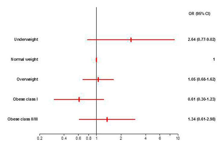 | Obese class II/III | 0.295 | 1.34 (0.61–2.98) | 0.468 |