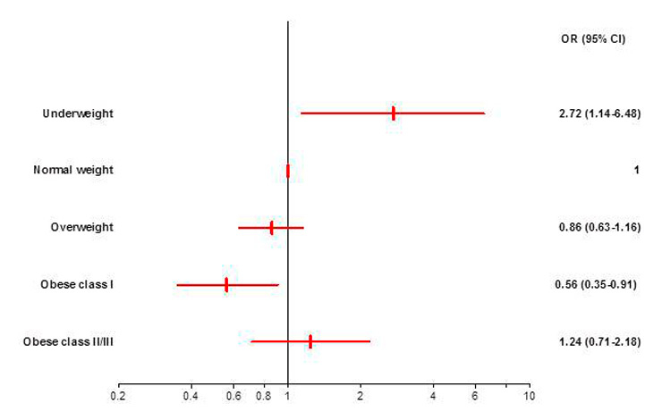 The fact that not all studies work with the same BMI classification system makes it difficult to compare results. The question arises whether the WHO classification used here is ideal for investigating the topic studied. According to the WHO, normal weight includes patients with a BMI between 18.5–24.9 kg/m2, a range which may include severely ill persons in the lower part. Several co-morbidities or chronic disease states are related to low body weight [26] and a low BMI may reflect an increased metabolic demand, catabolic or inflammatory state, or a generally poorer health condition. Critical voices hold that in studies using a BMI range of 18.5–<25 kg/m2 for normal weight, the mortality in the normal weight group may thus be increased, leading to an apparent protective effect of a higher BMI [27]. However, an additional multivariate logistic regression analysis where we excluded patients with a BMI below 20 kg/m2 showed minimal changes in the odds ratios of BMI groups and all other covariates (data not shown). The underweight group in this study had an increased crude in-hospital mortality compared with the normal weight group but the relationship became non-significant after adjustment, probably due to the low number of patients in the underweight group.