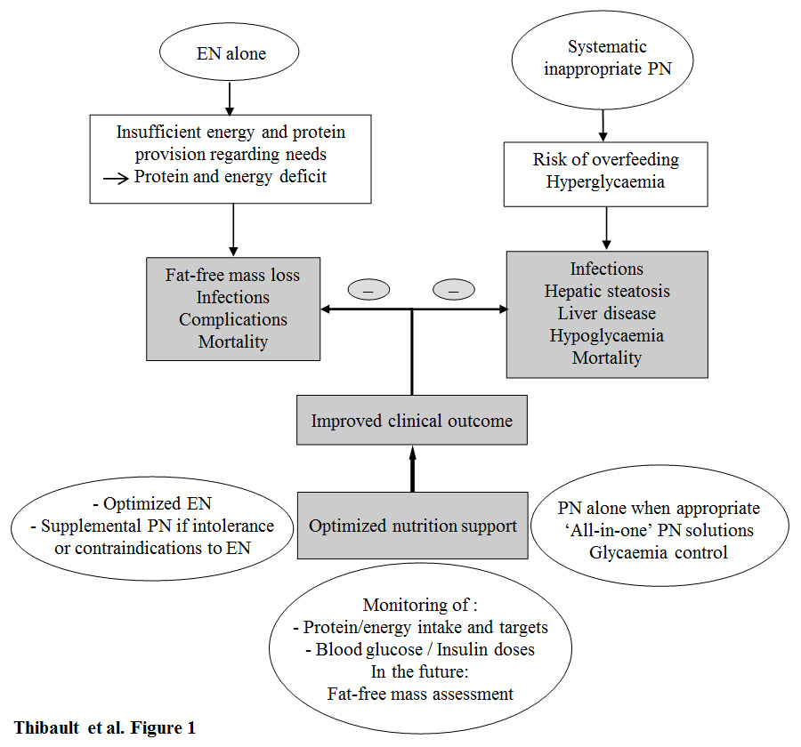 Improved clinical outcome with optimised nutrition support and monitoring in the intensive care unit. Enteral nutrition (EN) alone is often associated with an insufficient energy provision, leading to energy deficit; the latter is associated with fat-free mass loss, increased risk of infections and complications, and increased mortality. Systematic parenteral nutrition (PN) without appropriate indication is associated with increased risks of overfeeding, hyperglycaemia, and promotes infections, hepatic steatosis, liver disease, hypoglycaemia (as a result of high insulin doses), and mortality. Optimal nutrition support improves the clinical outcome. It includes the adequate choice of nutritional support: i) EN in first line, then together with supplemental parenteral nutrition in case of failure or contraindication to optimised EN; ii) parenteral nutrition alone when appropriate with respect to the indications, the preferred use of ‘all-in-one’ solutions, and the glycaemic control; iii) the nutritional and metabolic monitoring: adequation of protein/energy provision towards target, blood glucose and insulin doses according to on-going protocols. The assessment of fat-free mass may become the key part of the nutritional management of ICU patients, but validation studies are needed.
