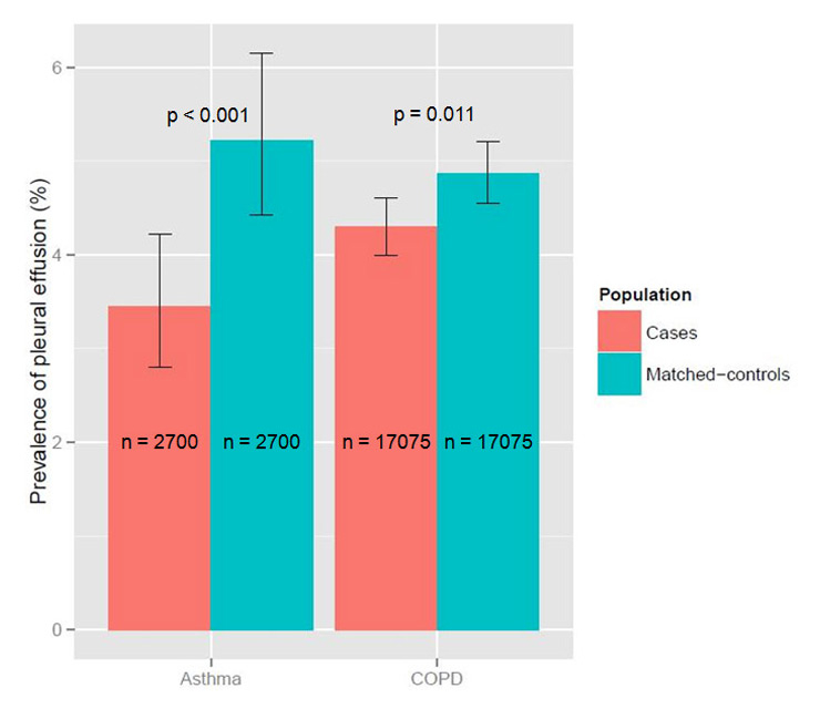 Prevalence of pleural effusion in hospitalised COPD and asthma patients compared to their matching controls without lung disease.