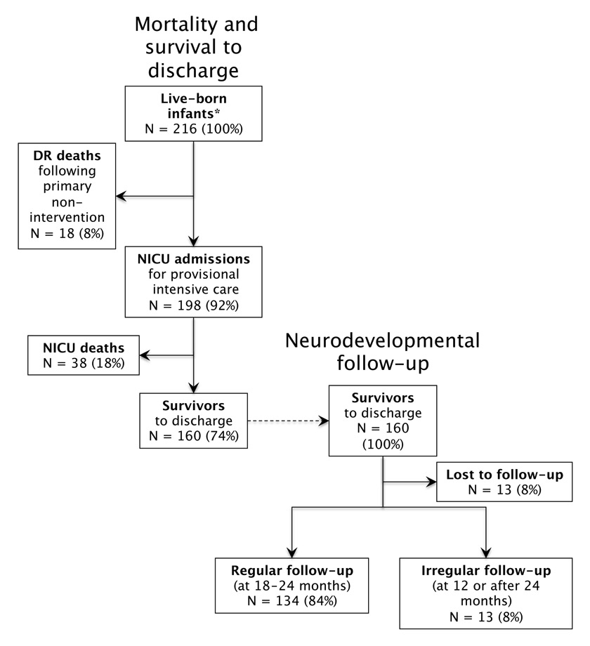 This retrospective cohort study was carried out to determine the impact of the centre's high survival rates of ELGANs on the rates of both severe neonatal morbidity and neuro-developmental impairment (NDI) at the age of 18 to 24 months. The results were compared with published data from contemporary national and international cohorts.