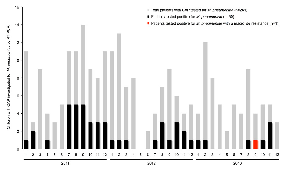 Case distribution of children with community-acquired pneumonia (CAP) investigated for Mycoplasma pneumoniaeby real-time polymerase chain reaction (RT-PCR) in respiratory specimens (n = 241) during the study period between 2011 and 2013.