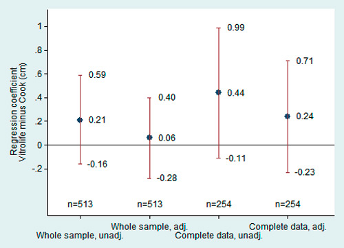 No conclusive evidence for a difference in birthlength between culture media was found (fig. 3). Before adjustment for the confounding factors, Vitrolife® children were in the average 0.44 cm longer than Cook® children, with 95%CI ranging from –0.11 to 0.99. After adjustment, the difference remained in favour of Vitrolife®, but with smaller amplitude (mean difference: 0.24 cm; 95%CI from –0.23 to 0.71 cm). Again, our data provide no evidence for a difference in birthlength between cycle types (mean difference 0.07 cm in favour of fresh cycle, with 95%CI from –0.36 to 0.50).