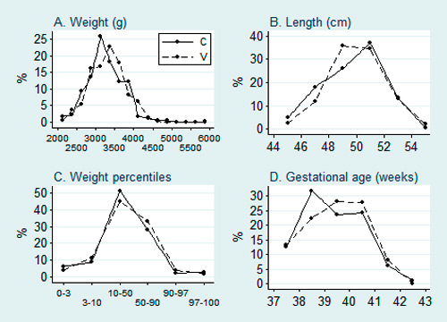 | Average height newborn (cm) | 49.5 (2.0) | 49.3 (2.1) | 0.37b |